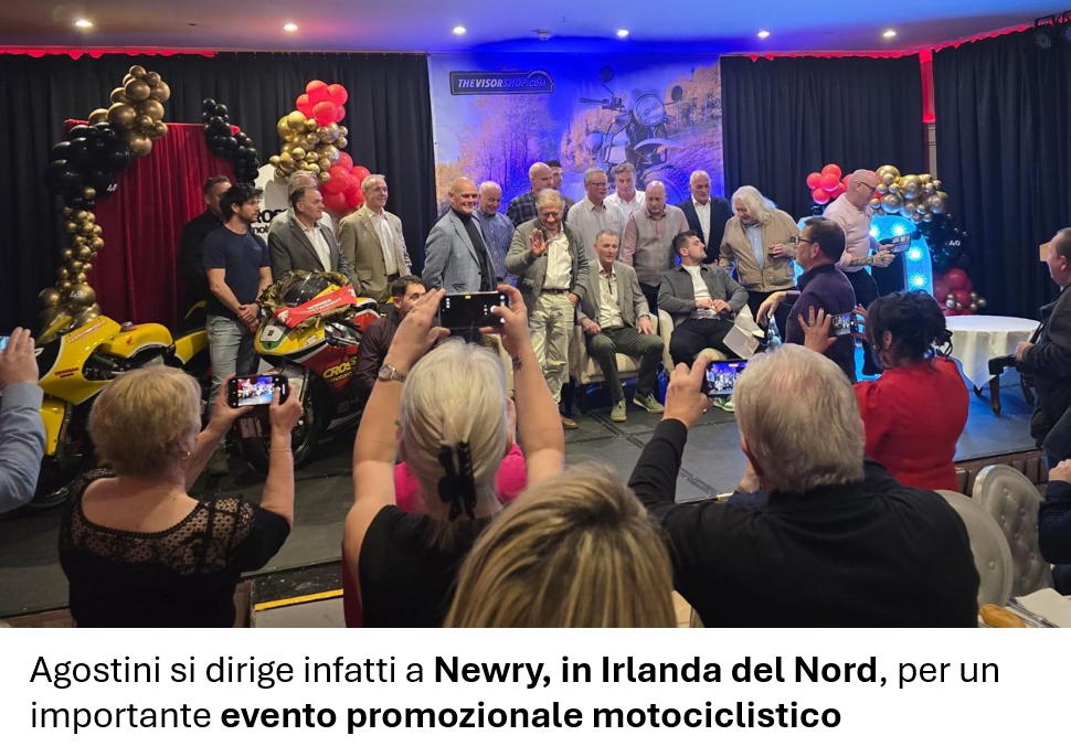 Dublino è solo la prima tappa. Agostini si dirige infatti a Newry, in Irlanda del Nord, per un importante evento promozionale motociclistico. Ad attenderlo circa 300 persone tra sponsor, fan e followers. Un vero e proprio bagno di folla, tra autografi, fotografie e racconti di imprese che hanno scritto pagine leggendarie del motociclismo mondiale.