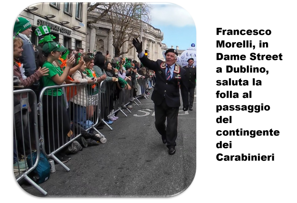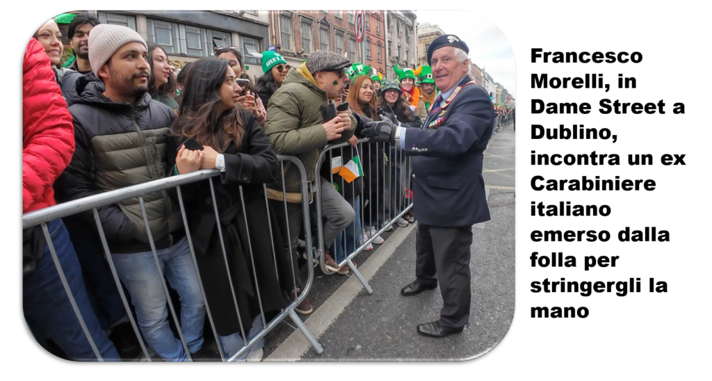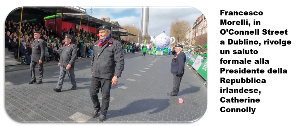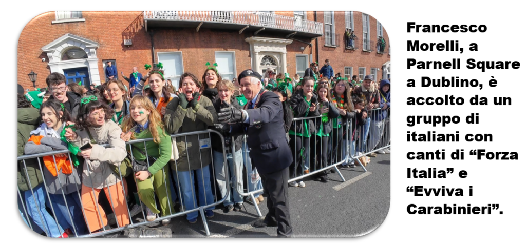I Carabinieri sfilano lungo le vie della capitale celtica davanti a mezzo milione di persone. Una visibilità straordinaria all’estero per l’Arma, rafforzata anche dalla presenza della Federazione Italiana Dei Combattenti Alleati (FIDCA) sezione EIRE e del II BTG ACA di Fossano, che contribuisce a dare ulteriore prestigio e valore istituzionale al contingente italiano. Un contesto che consacra il ruolo di Francesco Morelli, Presidente della sezione irlandese dell’Associazione Nazionale Carabinieri, autentico ambasciatore di questo corpo in terra irlandese. C’è un momento, lungo il percorso della parata di San Patrizio, in cui la festa sembra fermarsi. Lo sguardo della folla si sposta: non sui carri, non sulla musica, ma su un gruppo di uomini in uniforme. Sono i Carabinieri italiani, e attorno a loro nasce qualcosa di inatteso: applausi, sorrisi, richieste di autografi.