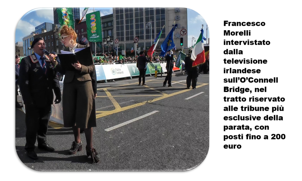 È proprio qui, nel cuore della città, lungo O’Connell Bridge, davanti a uno dei palchi più esclusivi della parata, dove il pubblico arriva a pagare fino a 200 euro per un posto a sedere , che Morelli viene intervistato dalla televisione irlandese, mentre la folla osserva e applaude. Una scena che restituisce la misura di quanto l’Italia, anche attraverso i suoi simboli, sappia farsi riconoscere e rispettare anche nella capitale celtica.