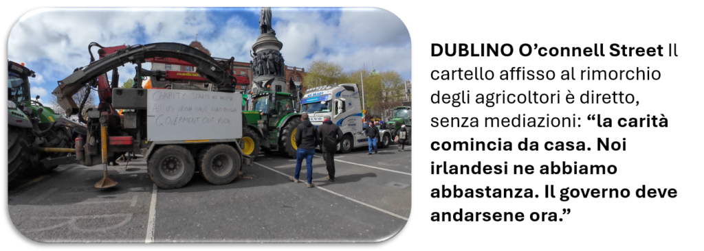 Il prezzo del diesel , sia per autotrazione che per uso agricolo, ha raggiunto livelli insostenibili, mettendo in ginocchio interi settori. Agricoltori, trasportatori, lavoratori autonomi denunciano una situazione ormai fuori controllo: i costi operativi aumentano, i margini si azzerano, il lavoro si ferma. In Irlanda, il diesel agricolo non è sostituibile: senza carburante, non si produce, non si trasporta, non si lavora. A questo si aggiunge la pressione fiscale. Carbon tax, accise, tassa NORA vengono percepite come un peso insopportabile su un sistema già fragile. I manifestanti chiedono misure immediate: un tetto ai prezzi, una revisione delle imposte, una strategia energetica nazionale. Non è una protesta ideologica: è una richiesta di sopravvivenza economica.