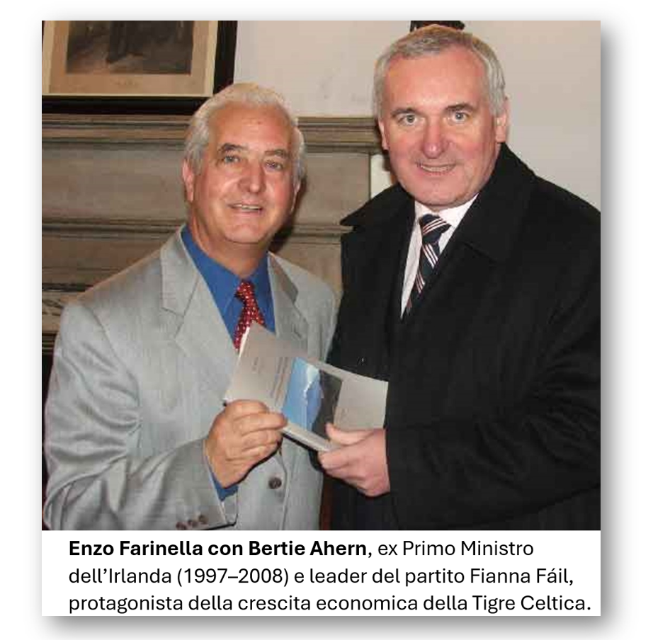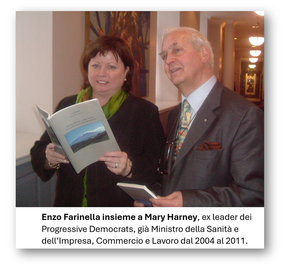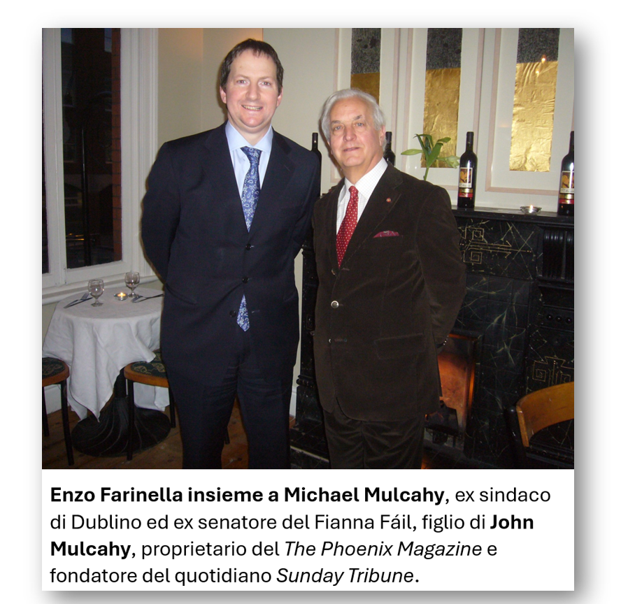 «È una coincidenza straordinaria: insegno antropologia e filosofia nella stessa scuola dove Michael Higgins, l’ex Presidente della Repubblica d’Irlanda, insegna sociologia. Diventiamo amici e lo siamo ancora oggi. Ricordo con particolare emozione quando, dopo un suo importante discorso, mi concede la grande opportunità di avere un’intervista privata con lui proprio nello studio del sindaco di Dublino. Ma i miei rapporti con le istituzioni non si fermano qui: ho avuto ottimi legami con figure come Enda Kenny e con il commissario europeo Pádraig Flynn, che lancia ufficialmente uno dei miei libri a Dublino durante un pranzo istituzionale.»