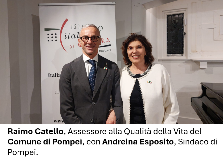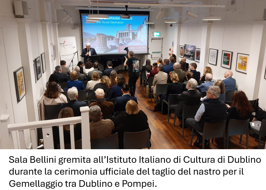 Il Gemellaggio tra Dublino e Pompei alza il sipario. Giovedì 12 febbraio, alle 16:30, presso la Sala Bellini dell’Istituto Italiano di Cultura di Dublino, si apre ufficialmente una nuova stagione di relazioni tra le due città. Nicola Faganello, Ambasciatore d’Italia in Irlanda, e Michela Linda Magrì, Direttrice dell’Istituto Italiano di Cultura di Dublino, fanno gli onori di casa, accogliendo una platea di rappresentanti istituzionali italiani e irlandesi di primo piano, a testimonianza del valore culturale e diplomatico dell’iniziativa.