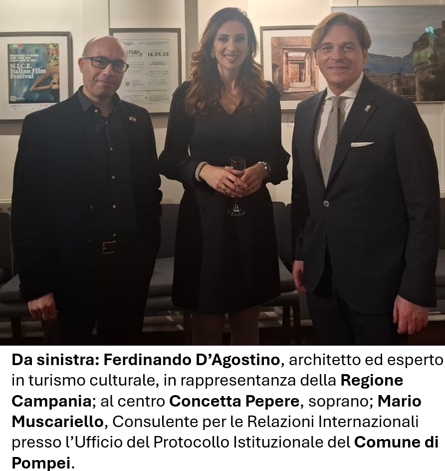 Il momento artistico è impreziosito dalla voce del soprano Concetta Pepere, che contribuisce a rendere la serata ancora più solenne e simbolicamente intensa. L’evento promozionale celebra il Patto di Gemellaggio tra le città di Pompei e Dublino, cuore dell’iniziativa organizzata a Dublino dall’Ambasciata d’Italia in Irlanda, dall’Istituto Italiano di Cultura, dall’Ente Nazionale Italiano per il Turismo, dall’Agenzia ICE e dalla Camera di Commercio Italiana-Irlandese, che invitano il pubblico irlandese all’appuntamento intitolato «Pompei & Regione Campania: Destinazione culturale e turistica».