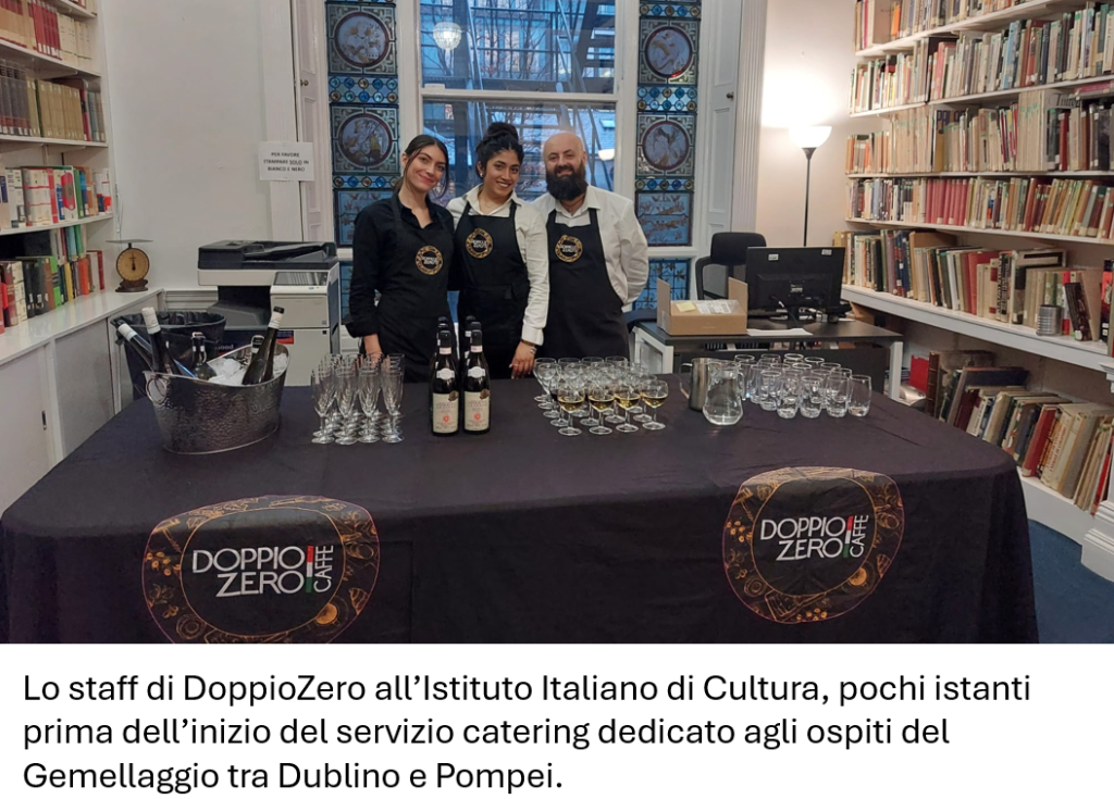Il catering dell’evento è stato curato da DoppioZero, noto ristorante italiano di Abbey Street Upper, nel cuore di Dublino, punto di riferimento per l’autentica cucina italiana nella capitale irlandese. Una scelta che sottolinea con forza l’italianità dell’incontro, non solo sul piano istituzionale ma anche su quello conviviale. Il menù ha proposto piatti profondamente legati alla tradizione: dal mini spiedino di bufala campana e datterino al basilico, al cuoppo napoletano con fritti misti, dai cubetti di frittata di spaghetti alla pasta mista con provola e patate e guanciale croccante. A chiudere, i simboli della pasticceria partenopea: pastiera napoletana e chiacchiere di Carnevale. Una proposta in perfetta armonia con la cultura italiana, dove la tavola diventa espressione di identità, tradizione e dialogo tra popoli.
