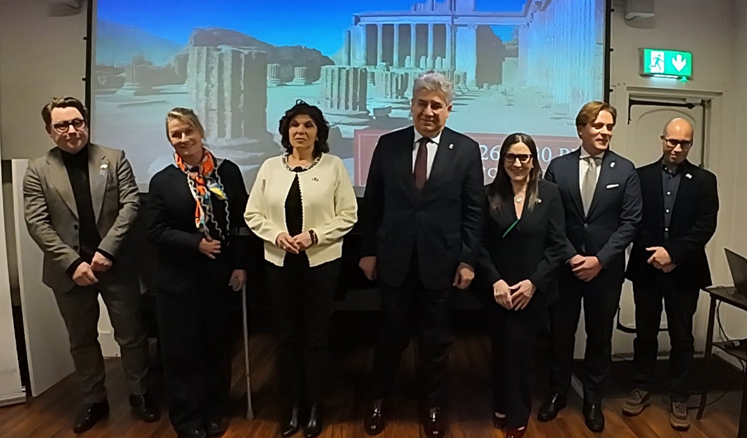 Daithi Downey, Responsabile dell’Ufficio Programmi Europei e delle Relazioni Internazionali del Comune di Dublino; Lynda Mulvin, Professoressa di Storia dell’Arte presso la University College Dublin (UCD); Andreina Esposito, Sindaco di Pompei; Nicola Faganello, Ambasciatore d’Italia in Irlanda; Michela Linda Magrì, Direttrice dell’Istituto Italiano di Cultura di Dublino; Mario Muscariello, Consulente per le Relazioni Internazionali presso l’Ufficio del Protocollo Istituzionale del Comune di Pompei; Ferdinando D’Agostino, architetto ed esperto in turismo culturale, in rappresentanza della Regione Campania.