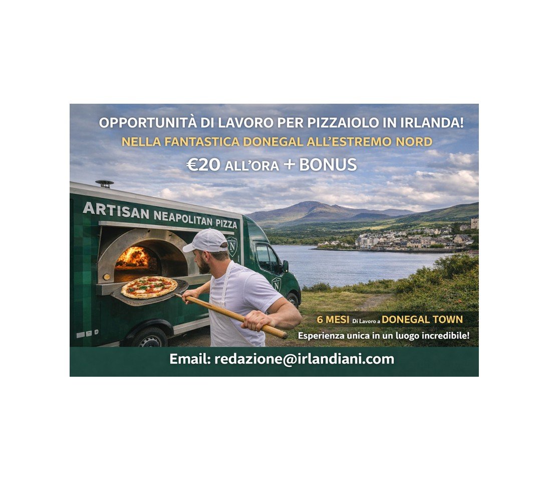 Opportunita’ nel Donegal Town, Azienda irlandese è alla ricerca di un pizzaiolo per un periodo di 6 mesi a partire da aprile, da inserire in un’attività dinamica e in crescita, con possibilità di incremento delle ore grazie all’apertura di una seconda sede. L’offerta prevede una retribuzione di €20 all’ora, con bonus aggiuntivi legati alla produzione e alle vendite, e un ambiente di lavoro che richiede autonomia, responsabilità e spirito imprenditoriale. Il ruolo include la preparazione della pizza con ingredienti italiani, la gestione operativa del servizio e il contatto diretto con il pubblico, in un contesto particolarmente attivo nei fine settimana. Si tratta di un’opportunità concreta per lavorare in una delle aree più affascinanti d’Irlanda, con possibilità di supporto nella ricerca dell’alloggio.