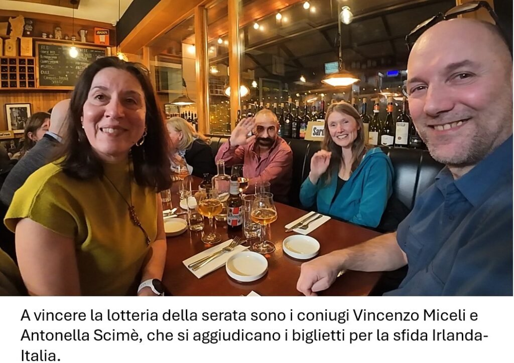 La serata si chiude con una lotteria. Il primo premio, due biglietti per Irlanda-Italia del Torneo delle Sei Nazioni e un voucher per una cena per due alla Pizzeria Wallace’s Asti, va a Vincenzo Miceli e alla moglie Antonella Scimè, in Irlanda da oltre vent’anni. «Non seguo il rugby, ma questa è la volta buona per iniziare. Sono molto contento di essere qui e di aver conosciuto questo ristorante e tanti italiani», dice Miceli. Il secondo premio va a Cristiano Costanzi: «Che bello aver vinto una