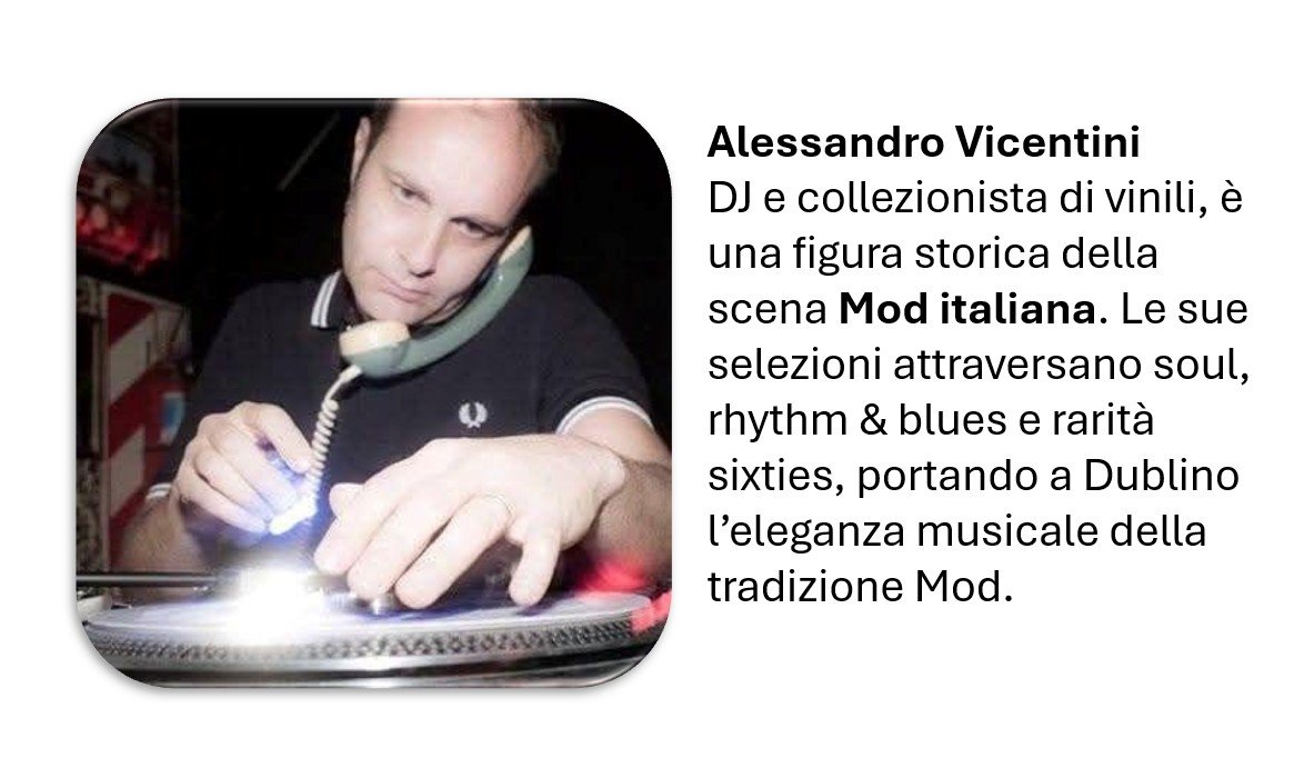 Poi c’è Alessandro Vicentini, veterano della scena Mod italiana. Chi frequenta raduni sixties e serate dedicate alla cultura Mod conosce bene il suo nome: una presenza storica, capace di far vibrare la pista con selezioni autentiche e ricercate. A completare la line-up è Michele Savini, figura centrale della comunità musicale italiana a Dublino. DJ, collezionista di vinili e fondatore del progetto Soundglasses, Savini è da anni una delle anime della scena Mod irlandese.