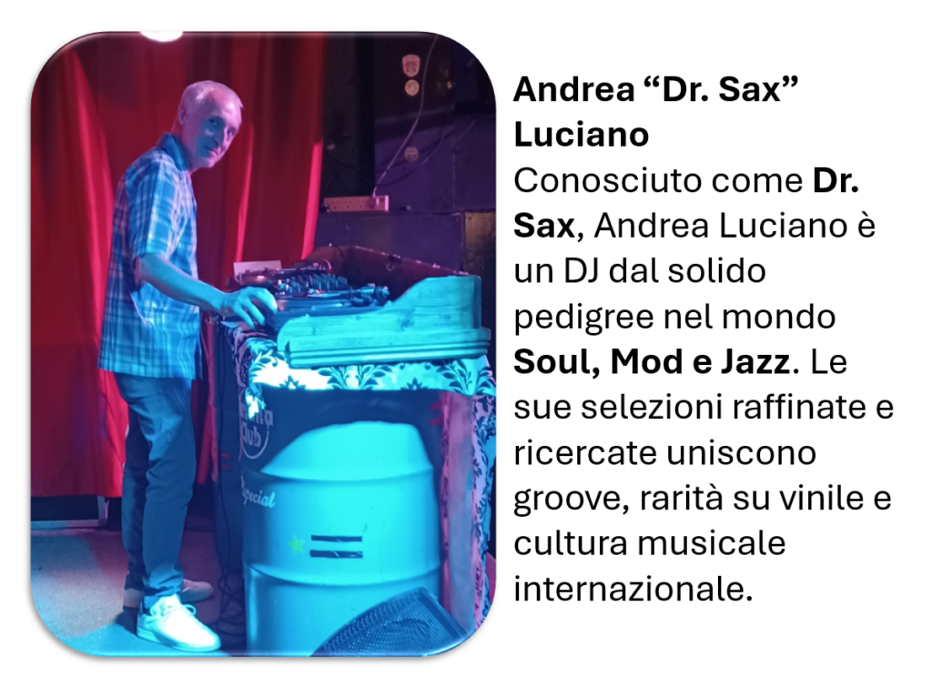 Sul palco del Thomas House, Salva introduce una line-up che è una vera dichiarazione d’amore alla scena italiana. Accanto a lui arriva Andrea “Dr. Sax” Luciano, DJ con un pedigree impeccabile nel mondo Soul, Mod e Jazz. Le sue selezioni sono un viaggio raffinato tra rarità su vinile e groove eleganti, costruiti con quella cura musicale che da sempre caratterizza i collezionisti italiani.