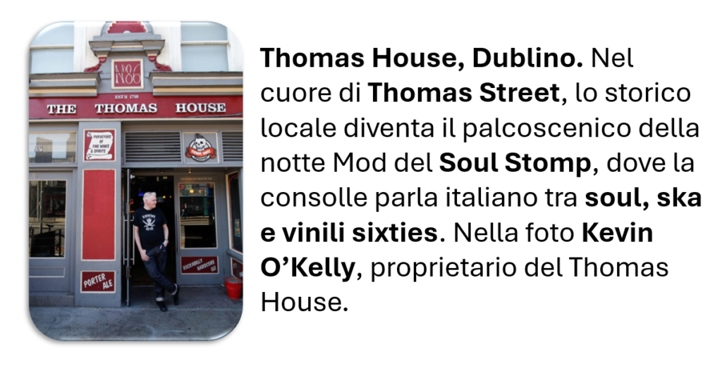 Non è solo una serata musicale. È la dimostrazione concreta di quanto la cultura musicale italiana sia oggi parte integrante della scena dublinese. L’Italia arriva con i suoi DJ, i suoi vinili, il suo stile. Porta con sé ricerca musicale, passione e una tradizione di culto per il suono analogico che trova terreno fertile anche in Irlanda. E così, per una notte, Dublino parla italiano. Soul Stomp diventa il simbolo di qualcosa di più grande: un ponte culturale tra Irlanda e Italia costruito attraverso la musica. Da una parte la tradizione Northern Soul britannica, dall’altra la scena Mod italiana che la reinterpreta, la colleziona, la protegge e la rilancia. Il risultato è una pista da ballo dove le frontiere scompaiono e resta solo una cosa: la musica. Acquista il biglietto